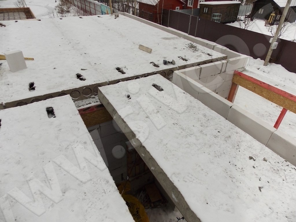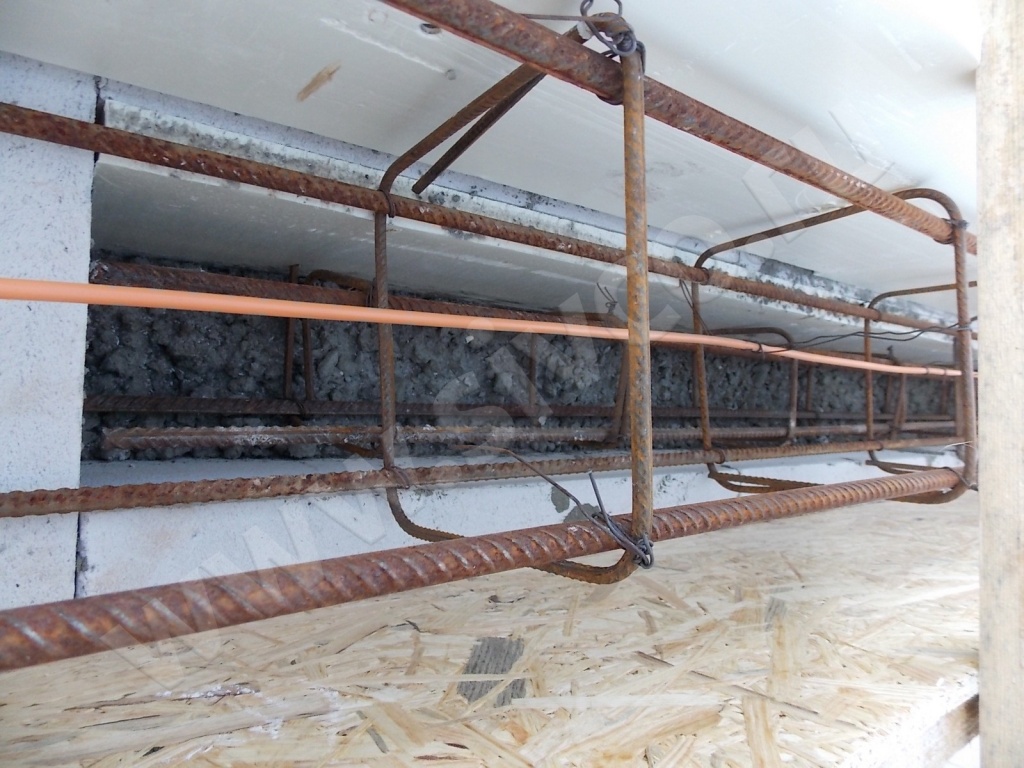 Укладка плит перекрытий производилась на армпояса из железобетона. В качестве опалубки для армпояса были применены готовые U-образные газобетонные блоки YTONG. Армирование пояса под ЖБИ плиты было выполнено в виде 4-х стержневой пространственной конструкции из 12 мм арматуры, заливка производилась бетоном М300. Для утепления перекрытий был использован ЭППС с доборными 100 мм блоками из комплекта Итонг.