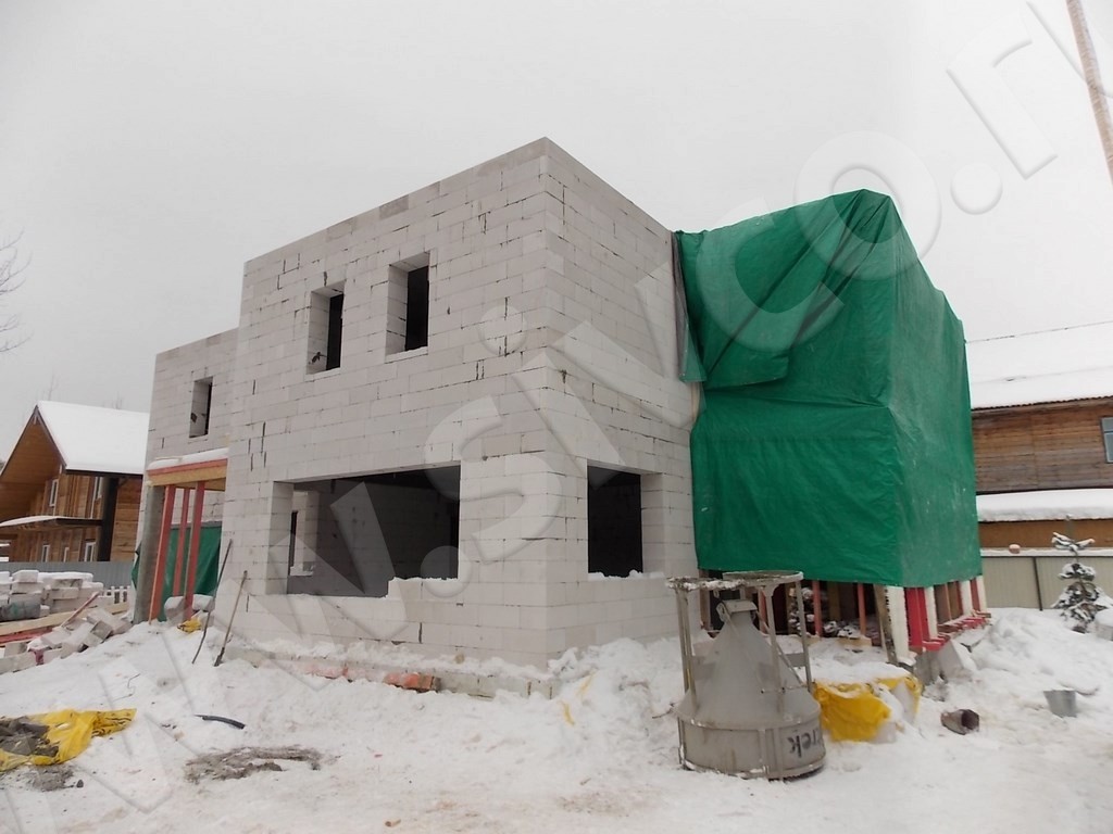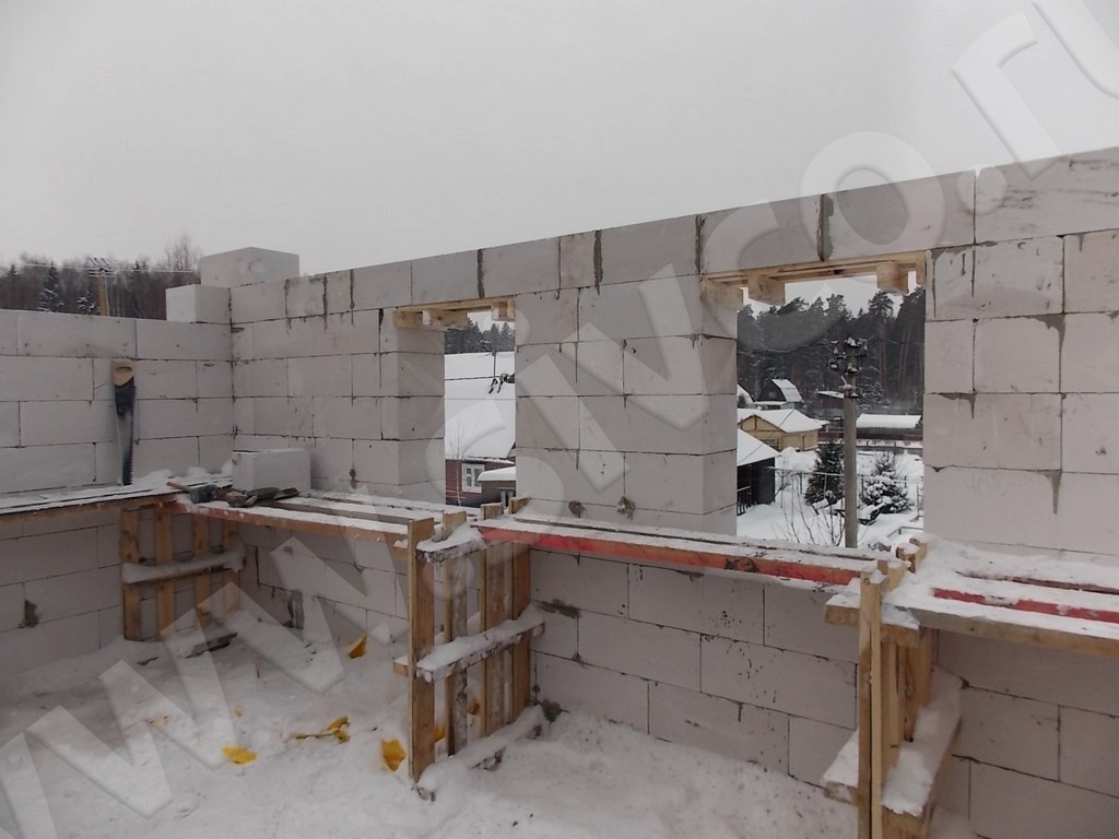 Строительство дома производилось в зимний период, поэтому при кладочных работах нами был использован зимний клей для газобетонных блоков, что позволило проводить работы даже при температуре до минус 10 градусов. Отдельно решался вопрос с подогревом бетона в период набора прочности: монолитные участки прогревались тепляками, а для прогрева армпоясов и перемычек мы заложили специальный греющий кабель.